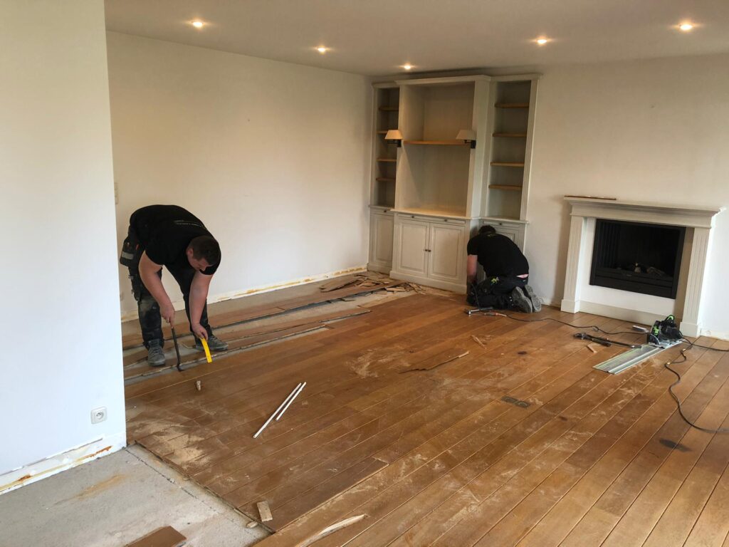 Het renovatieproces begint met een grondige inspectie van uw parketvloer. Wij controleren op beschadigingen, diepe krassen en verkleuringen. Vervolgens verwijderen wij alle meubels en, indien nodig, de plinten en sierlijsten rondom de vloer.